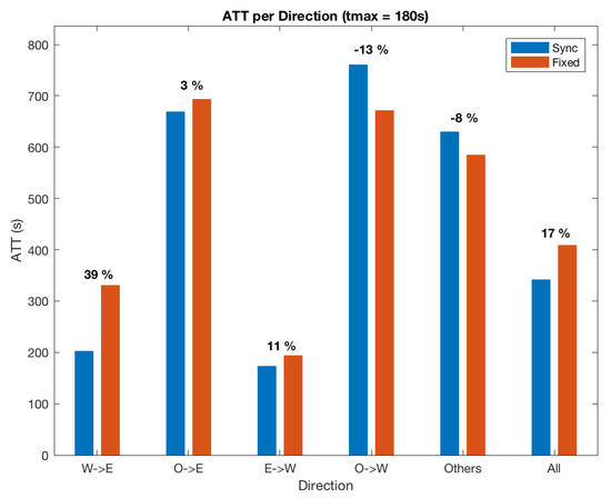 All the results presented so far have only considered vehicles traveling on the arterial road from the West to the East while ignoring the vehicles traveling on other directions. This is because this solution aims primarily at reducing the congestion level in the city centre by maximizing the number of vehicles leaving it (West to East). Figure 16 depicts the ATT achieved for vehicles traveling in other directions. The description of all direction labels in Figure 16 is summarized as follows: W->E means West to East, O->E means Other than West to East, E->W means East to West, O->W means Other than East to West, Others means From/To North or South, and All refers to All directions. We can see that the ATT improvement could be positive or negative depending on the direction considered. The overall ATT improvement, when all vehicles in the network are taken into consideration, is 17%. There is also an improvement of 11% for vehicles traveling in the opposite direction of the prioritized one (East to West). From these results we can conclude that our proposed synchronized ATLCS does not only lead to significant enhancement of the ATT of the vehicles traveling on the prioritized direction but also yields an important decrease of the travel time across the whole network.