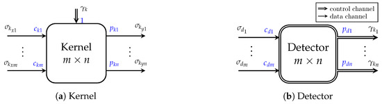 Detectors are the actors responsible for determining the kernel scenarios. A detector d can have multiple data input channels , containing fixed token rates , and multiple output channels, which can only be control channels , with production rates , which serves as control inputs for kernel [14]. A detector is illustrated in Figure 1b.