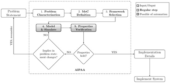 AIPAA also includes a step comprehending the system model properties verification, as described in Section 3.5. Its main purpose is to prove that the model holds the properties of the selected MoCs and possibly a set of system specific properties. In this sense, a range of methods can be applied to verify if the system holds each property, for example, mathematical prove and model analysis.