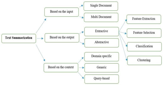 One method that deals with natural language processing (NLP) is ATS, which extracts the important sentences from related documents. Many researchers have focused on examining European languages and English at the Text Analysis Conference (TAC) and the Document Understanding Conference (DUC), however, there is a shortage of research on the Arabic language []. There are many types of methods that can classify text summarization, and Figure 1 shows the techniques of text summarization. Our research has examined multidocument text summarization based on extracting related and significant information from the Arabic language within a generic context [].