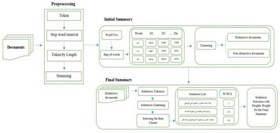More information about our proposed model is given as follows: Firstly, we apply text cleaning to solve the noisy problem. Then, a CBOW model is used to capture the semantic relationship between the terms (word tokens). Then, we apply a K-means algorithm with a cosine similarity measure as the threshold to select the distinctive documents from each category based on the distance metric. These documents will also be used in generating the final summary. The final step is to tokenize these documents to lists of sentences and apply another iteration of the K-means algorithm to select distinctive sentences, where W-PCA is then applied using three kind of features, as discussed, in order to assign the weights for each sentence. These weights help us to select and order the sentences for the final summary.