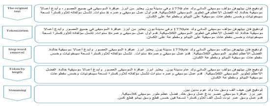 Text preprocessing is the main stage for the text simplification method, and the steps are divided into five sub-steps. We started with text tokenization. In this step, we tokenized the text to a set of sentences. Then, we applied filtering to remove the stop word list, deleting all unnecessary words like (في, على) (in, on). After that, we applied a tokenization by length technique and selected 3 to 25 characters in each term. This helps us keep words with three letters. The fourth step was to use the stemming to transfer all the selected words, for example التمويل will be مول, changing from funding to fund. The last step is to represent the significant words as vectors use the word2vec model [], based on the continuous bag of words (CBOW) model. This approach was trained by utilizing Wikipedia and Google News, with 100 as the dimension size of each word. The final parameters for the CBOW were a window size of 5, layer size of 100, and a minimum vocab frequency of 2. This approach was used to predict the occurrence probability , of a root,, given the context roots . In this approach, preselected window size is represented by c and is the root vector in a featured word. We adopted this approach for word vector training []. At the end of this stage, we resolved the noise problem. Figure 3 shows the summary for all the above steps. Figure 4 shows the vectors of the root based on the CBOW, an important observation from the picture is that the word موسيقى, which means music, is an important word in the “Music and Art” category. The output of this step was used to solve the noise problem [].