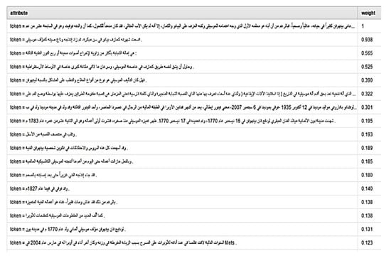 Most of the recent studies have used PCA for solving the dimensional reduction problem [], so this paper also used PCA for overcoming readability and coherency problems. We applied W-PCA for mapping the distinctive sentences list to the weights that ranged from 0 to 1. Then, we used the selection by weight method and assigned the parameter P with a value of 0.3, where this thereby means that we selected the top 30% from the list of sentences as the final summary. Figure 5 shows the samples of the list of sentences when mapping by weight.