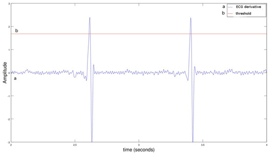 The only information required for calculating the QRS complex is represented by the detected peak index because, multiplying it by the sampling frequency reciprocal, it is useful to trace the beat time. Moreover, we had to determine which peak signals above the threshold may be considered a heartbeat. Actually, these values are more than one around a QRS complex. In order to simplify it, we chose the first value above the threshold. Figure 4 shows the peak signals of an ECG derivative.