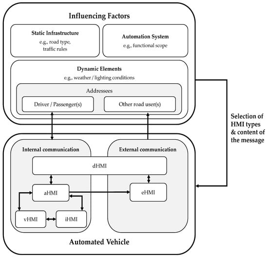 The framework is structured as a circuit. The influencing factors affect the selection and the content of the HMI types, resulting in the use of the most appropriate HMI types in a given scenario. As a result, the AV’s communication influences the addressees’ behavior, and thereby ultimately the interaction between the AV and its surrounding. Moreover, in the process of driving the static infrastructure, the dynamic elements, as well as the capabilities of the automation system itself change over time. This in turn influences the suitability and the selection of the HMI types and their content.