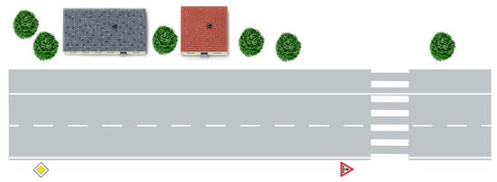 Static characteristics of an urban road scenery. The static influencing factors in this example include a two-lane road, a bike lane, and a zebra crossing. The traffic signs provide further information about the prevailing traffic rules. Additionally, the scenery includes houses and trees.