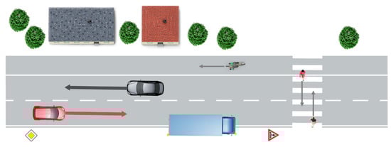 The first factor influencing the suitable communicational means is the static infrastructure. The static infrastructure consists of all elements in the scenario that remain constant over time. Among others, this includes the road type (geometry, speed limits) with possible lanes, entrances and exits, and visual constrictions either for the AV’s sensors or for the AV’s passengers or surrounding HRU. Additionally, a decisive factor is the vulnerable road users (VRU) infrastructure. Moreover, the prevailing traffic rules influence the interaction and communication needs between the AV and other HRU. Using the example of an urban road section, the mentioned components would be listed as essential static characteristics and attributes (see Figure 2).