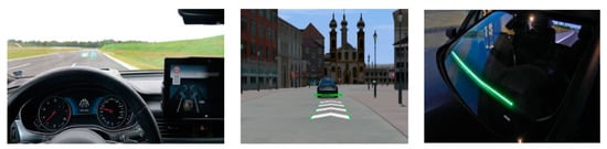 - Feierle, A.; Beller, D.; Bengler, K. Head-Up Displays in Urban Partially Automated Driving: Effects of Using Augmented Reality. In Proceedings of the 2019 IEEE Intelligent Transportation Systems Conference (ITSC), Auckland, New Zealand, 27–30 October 2019; pp. 1877–1882. [Google Scholar] [CrossRef]