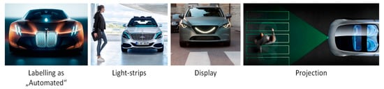 External HMIs are interfaces installed on or projecting from the external surface of a vehicle. Indicators and brake lights are legally required realizations of eHMIs and highly standardized. Via the eHMI, the AV communicates with other HRU and provides information about the AV’s status or its behavior. External HMIs could be clustered in auditory eHMIs [,] and visual eHMIs. In the context of the electrification of transport especially in low speed scenarios, hybrid electric or pure electric vehicles emit substantially less noise than comparable vehicles with combustion engines []. Due to the missing engine sound, electric vehicles are less perceivable particularly for blind or visually impaired pedestrians []. Auditory eHMIs could help these people, since quieter electric AVs are detected later in approaching scenarios than vehicles with a combustion engines []. To counteract this fact, auditory eHMIs could have the potential to support communication between electric AVs and VRU. At present, visual eHMIs are almost exclusively investigated in research for AVs. Figure 5 structures visual eHMIs in four different categories, marking a vehicle as “driving automated” [,], light-strips [,,] communicating via light patterns, displays [,,,,] showing text or symbols, and laser projections [,,,] projecting the message of the eHMI on the street.