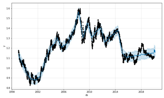 The fuzzy Delphi method supported by the Prophet library presents the EUR/USD exchange rate in two months. The data for the model creation were collected from the [45] website. Their graph with the Prophet forecast can be seen in Figure 1.