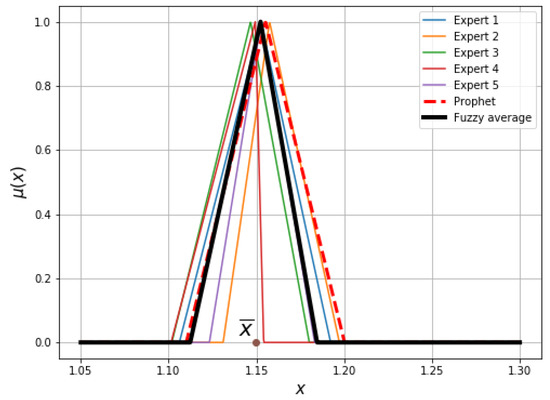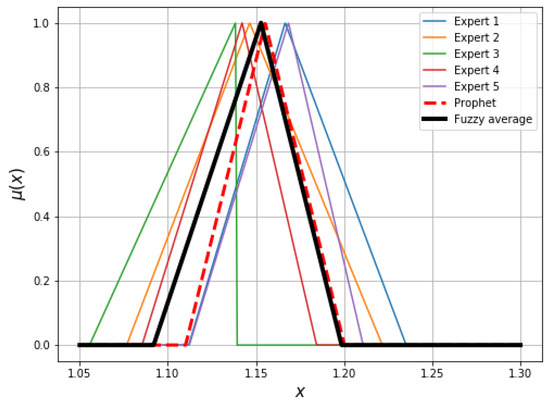 Expert forecasts, together with Prophet forecast, are shown in Figure 2 and Table 1. The calculated fuzzy mean value and crisp value can be found in Figure 3 and Table 2. Then the second round of forecasts begins, in which experts view the value of . The results are shown in Table 3. This round ends with a recalculation of the fuzzy average and crisp value (Table 2). The final forecast for the euro-dollar exchange rate is .