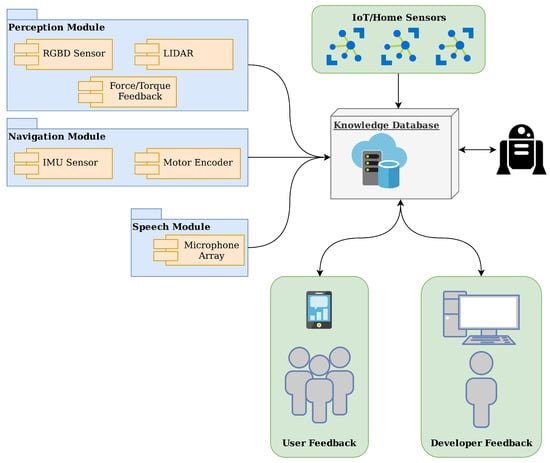 - Data fusion from multiple sourcesAs we discussed in Section 4.2, some works have attempted to assist robot agents with data collected from environment sensors [48,49]. Robots alone cannot fully understand the dynamics of their environment due to limited perception ability. Information gathered from external environment sensors and older adults’ inputs can thus be used to help robots better understand their surroundings and older adults’ demands. Currently, most studies are treating robot platforms independently and omitting the chances of evolving robots with external data sources.