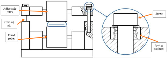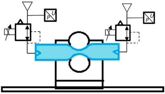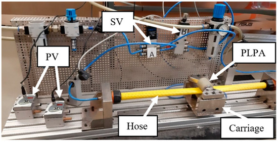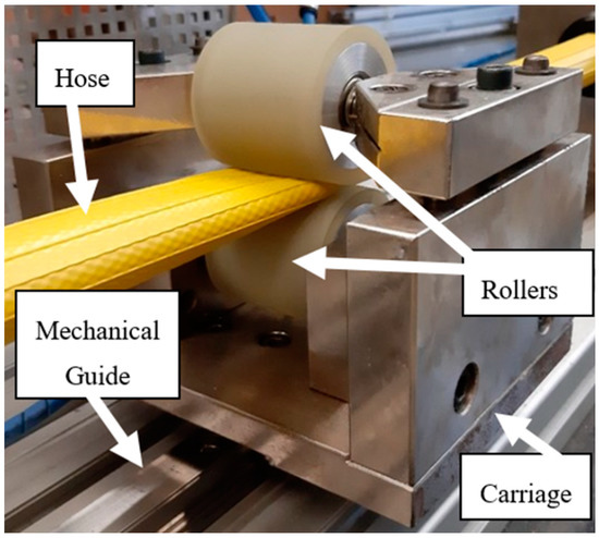 The complete experimental setup used in this work is shown in Figure 3 and includes a PLPA mounted on a carriage, running over a Bosch Rexroth guidance system (IMS series). Based on the results obtained in [13] regarding the longevity of the PLPA, several modifications to the original setup were made in an attempt to increase its service life: first, the two aluminum rollers on the PLPA have a urethane coating to reduce the stress in the hose. In this setup, the bottom roller is fixed to the carriage and the top one’s height is adjustable with the help of two screws on each side. If a set of four spring washers on each of these screws is used, the force between the rollers can be imposed. A drawing of the carriage with the spring washers is shown in Figure 4. In addition, the hose chosen for this study was FLEXIGOM AIR, manufactured by Productos Mesa (Santo Domingo de la Calzada, Spain), which was the most durable hose tested in [13]. This hose, designed for use with compressed air at a 30 bar maximum working pressure, comprises a flexible nitrile rubber sleeve reinforced with a high tenacity polyester fabric and an abrasion-resistant external coating. In addition, the setup includes two FESTO servo valves (SV) and two proportional pressure-reducing valves (PV), which allow flow/pressure control of the compressed air in each chamber, respectively. These valves are connected to the PLPA in different ways, according to the test to be carried out.