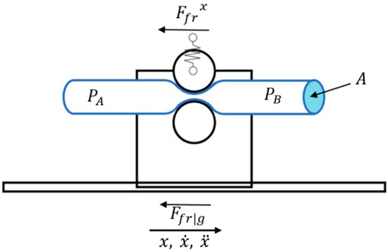 The linear peristaltic actuator considered in this work is depicted in Figure 1: compressed air is fed to one end of a hose, which is divided into two chambers by two rollers pressed against it. The pressure difference between chambers caused by compressed air creates a force () acting on the rollers. This force contains a vertical component () which is absorbed by the roller supports and a horizontal component () that drives the rollers. A mechanical guide connected to the rollers absorbs the forces and torques acting on the system. In the motion direction, friction is exclusively due to the ball bearings (). Sliding friction arises in the transversal direction () due to the hose cross-section change [12]. However, since this direction is mostly orthogonal to the motion direction, it is expected that this sliding friction has an insignificant impact on the rollers’ motion. Figure 2 presents a diagram of the forces acting on the system.