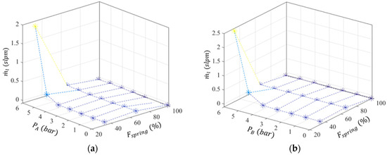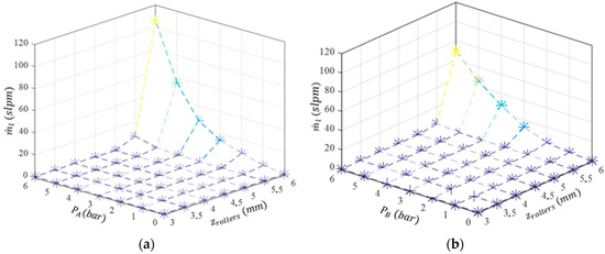 Regarding Figure 10, it can be seen that up to 5 bar, as long as the spring force is greater than 33% of , the leakage is essentially zero. In addition, if is bigger than 66% of , there is not essentially any leakage, regardless of the input pressure. Since it is expected that an imposed force between rollers might contribute to extend the service time of the actuator, the results presented in the following sections will be based on that adjustment.