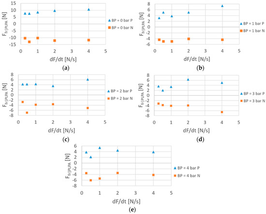 In the static friction experiments, the pressure in one chamber was kept constant while in the other chamber, it was increased until motion was detected. This was performed using the pressure-reducing valves as shown in Figure 11. Figure 12 shows the results obtained for negative (N) or positive direction motions (P), different backpressure values (0, 1, 2, 3, 4 bar), and force time gradients (0.25, 0.5, 1, 2, 4 N/s) obtained by changing the pressure inside the chambers with time.