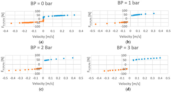 The experiments to determine the viscous friction of the PLPA were performed by imposing a constant velocity to the actuator using the servo valve connected to one chamber and connecting the other chamber to the atmosphere. The backpressure was increased from 0 to 3 bar with a 1-bar step [12]. Given the limited stroke of the actuator, constant velocities only up to ca. 0.5 m/s could be attained.