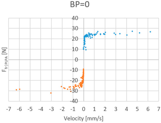 Regarding Figure 12, when there is no backpressure, static friction presents around double the value it has in the cases when there is backpressure. For instance, for the 2 N/s rate, the static friction force is 10 N for 0 bar backpressure, while it is 5 N for 1 bar backpressure. This is an interesting result that had already been found in [12] for positive direction motions. A possible justification for this is the fact that when there is no backpressure, only the active chamber is performing work to push the rollers apart; when there is backpressure, both chambers are pushing the rollers apart and, by doing so, the contact area inside the hose tends to be reduced. Consequently, so does the PLPA’s static friction. In addition, as also concluded in [12], there was not any significant difference on the results caused by the force gradient.