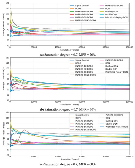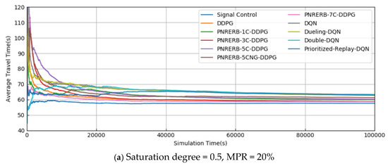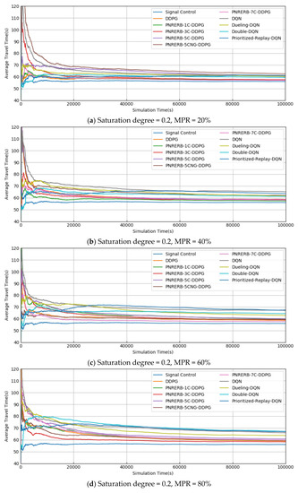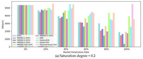Figure 8a–c show that under three different saturation degrees, with the increasing MPR, the stop time decreases gradually and the benefits increase gradually, except for some DQN-based methods (such as the Double-DQN method under 0.2 saturation). When the MPR is 60%, 80%, and 100% under the 0.2 saturation degree, the three methods of PNRERB-5C-DDPG, PNRERB-5CNG-DDPG and PNRERB-7C-DDPG are better than DDPG, PNRERB-1C-DDPG, and PNRERB-3C-DDPG, with the highest benefits of 99%, 97%, and 98%, respectively. For the five MPRs, the stop time of PNRERB-1C-DDPG, PNRERB-3C-DDPG, PNRERB-5CNG-DDPG, and PNRERB-7C-DDPG has little difference under 0.5 saturation. However, the stop time benefit of the DDPG method is slightly less.
