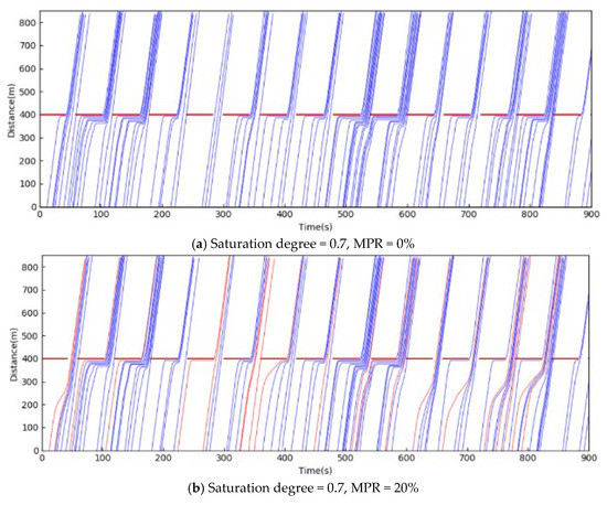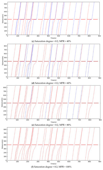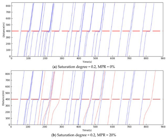 Through the above analysis, we have obtained the optimization results of six DRL methods. In order to further show the driving trajectory of vehicles, this paper chooses the spatial–temporal trajectory of the PNRERB-5C-DDPG method for further analysis, which has better optimization results. Figure 10 is the spatial–temporal trajectory of the PNRERB-5C-DDPG method under different MPRs of a CAV at the saturation degrees of 0.2 and 0.5. Figure 11 shows the spatial–temporal trajectory of the PNRERB-5C-DDPG algorithm under different MPRs of a CAV under the saturation degree of 0.7. The red line represents the trajectory of CAVs, and the blue line represents the trajectory of HVs.