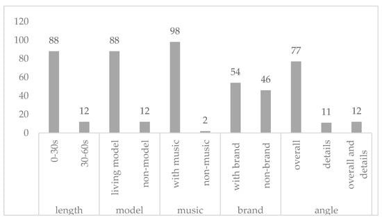 We found some characteristics of short video displays by sorting and summarizing 100 clothes retailers’ short videos as shown in Figure 1. The shortest video was 10 s in length, and the longest video was 60 s in length. Furthermore, 12 retailers did not adopt living models; instead, products were displayed in flat and T-stage ways. Ninety-eight retailers’ videos contained background music; however, some retailers used the same music for multiple products, and mismatches between the style of music and the clothing style were found to exist. Fifty-four retailers highlighted their brand in the video. Seventy-seven retailers displayed overall product information. Generally, videos that did not contain a model covered more of the details of products. Analyzed in terms of video length, 30 s was found to be the threshold value; videos longer than this were considered to be long videos, and videos shorter than this were considered to be short videos. Eighty-eight percent of shops displayed short videos. The majority of shops used living models and fashionable background music, and they highlighted the brand at the start or the end of a video. The majority of shops displayed overall product information, then covered the product both overall and in detail.