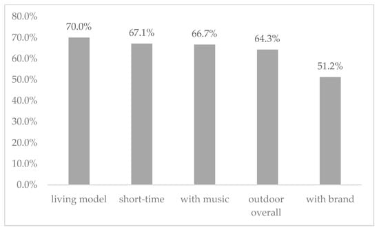 The statistical results of the questionnaires reveal that, compared with displays without a model, 70.0% of respondents were more likely to watch a video display with a living model, 67.1% of respondents preferred short video displays, 66.7% of respondents were more likely to watch videos with background music, 64.3% of respondents preferred overall product displays shot outdoors, and 51.2% of respondents prefer brand displays. Details are shown in Figure 2.