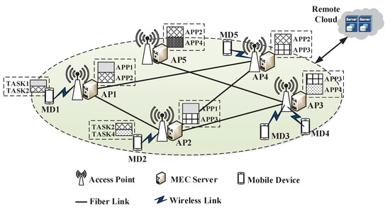 To handle the computation tasks requested by MDs, corresponding applications must be deployed on the APs. The application hosting in the AP that can process type-j task is called the APP-j. It is assumed that there exist K types applications provided by the APs, denoted by . Each AP v, with the maximum computing capacity , can only host at most Q types applications , where , . It is to say, one AP cannot handle all types of computation tasks, if AP v does not host the corresponding APP-j, it must forward the task to other APs for processing, thus cross-server offloading is caused. As depicted in Figure 1, AP2 can directly compute task1 and task2 of MD1, while it must forward the tasks of MD2 to AP5, or to AP3 and AP4, respectively.