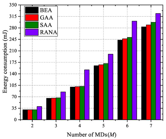 Performance comparison of the overall minimum energy consumption among BEA, GAA, SAA, and RANA with different numbers of MDs.
