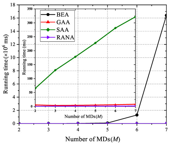Illustration of the running time comparison among BEA, GAA, SAA, and RANA with different numbers of MDs.