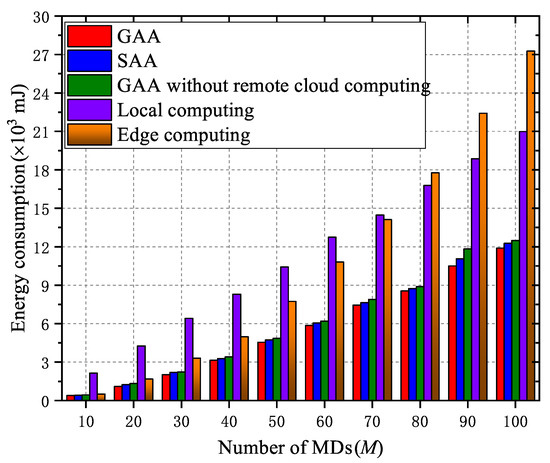 To further confirm the advantages of our proposed GAA, we run experiments on GAA and SAA with more MDs, i.e., M varies from 10 to 100 with the increment of 10, and compare their obtained minimum energy consumption with those by adopting other computing models, i.e., computing locally by MDs’ CPU, processing all the tasks on the MESs, and using GAA without RCC, respectively. Figure 4 presents the comparison results concerning these strategies. We can see from this figure, both GAA and SAA can obtain lower overall consumed energy than both local and edge computing models, which validate the necessity of task offloading. Moreover, one can also find that GAA always has better performance than SAA. Another aspect shown in Figure 4 is that the performance of GAA adopting all three computing models can achieve a little improvement over that of GAA without remote cloud offloading, which corroborates the superiority of collaborative computation offloading among the RCC, edge servers, and the MDs.
