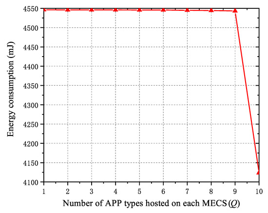 To identify how the computation resource of APs affects the total accomplishing time as well as the energy consumption, we deploy different number of APP types on each AP and compare the performances. This group of experiments is performed using GAA to get the near-optimal consumed energy. Here the number of MDs is set as 50 and that of APP types hosted on each MECS varies from 1 to 10. Figure 5 illustrates the comparisons of the obtained total energy consumption. From this figure, one can easily know that when the number of APP types, i.e., Q, increases, the total energy consumption decreases. When , the obtained results reduces slowly, while when , the total energy consumption shows a significant decline. This is due to the fact that if one AP hosts all types of APPs, it can process all types of computation tasks and need not forward them to other MECs, thus the total accomplishing time is reduced, and the energy consumption decreases.