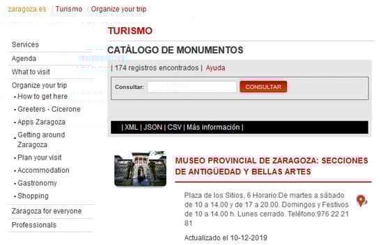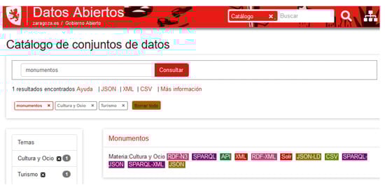 The Open Data Catalog collects the datasets posted on the Zaragoza’s web site. Currently, there are 149 open datasets published in this catalog. Datasets are organized by domain, format, update frequency, and key-words; in addition, a quick access to georreferenced datasets is also provided (up to date, there are 66 datasets with a geographic component). The idea is to offer any public item of information in as many formats as possible. In Figure 2 an excerpt from the Monumentos dataset search on the catalog page (https://www.zaragoza.es/sede/portal/datos-abiertos/servicio/catalogo) is shown. The result of this search is a link to the Monument dataset and a list of available data formats.