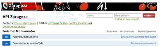In order to provide a friendly access point for interested re-users, the API has been published as a user web service. It is implemented with SWAGGER (http://swagger.io), an open-source tool which allows describing, producing, consuming, and visualizing RESTful APIs. This user interface provides details about open datasets published in the API, operations, parameters and allowed responses. Depending on the user authentication, the authorized API operations will be reachable on the interface page. For example, in Figure 4 the Zaragoza API user interface (http://www.zaragoza.es/docs-api) of the Monument dataset is shown. In this example, as an anonymous user only GET operations over the Monument dataset are available. In this case, the first operation allows retrieving a list of all monuments and the second allows retrieving data from a specific Monument. Further examples of the API usage are available on the Zaragoza’s GitHub repository (http://zaragoza-sedeelectronica.github.io/rest/queries).