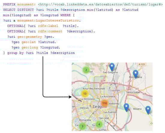 As above-mentioned in the Publication activity from Section 4, the city council manages a Virtuoso triplestore that provides a SPARQL endpoint (https://www.zaragoza.es/sede/portal/datos-abiertos/servicio/sparql). It allows to execute custom queries in order to retrieve specific data. For example, in Figure 5 an example of a Monuments query is presented. In this query, the requested attributes of Monuments are URI, title (name), description, and the coordinates of its location. In addition, an example of the location of the retrieved Monuments is presented over the map. The source code of this visualization example is available on the Zaragoza’s GitHub repository (https://github.com/zaragoza-sedeelectronica/zaragoza-sedeelectronica.github.io/tree/master/sparql/ejemplos/monumentos.html). In addition, other SPARQL query examples are also provided in another directory of this repository (http://zaragoza-sedeelectronica.github.io/sparql/queries/).