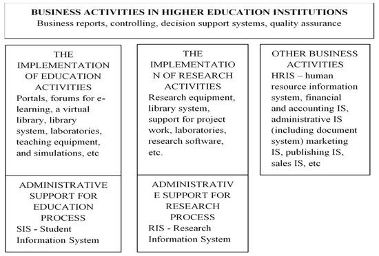The methodological assessment that was applied in this study can be summarized as follows: The authors carried out multiple case studies where the subjects were the UOT, MU and SU. These three establishments are different in terms of their history. The inductive approach was appropriate in this study, since it involves qualitative research where researchers collect data and develop a theory on the basis of data analysis. Data collection was based on interviews regarding the level of Information and Communication Technology (ICT) in all three universities with an emphasis on the deployment of ISs. In order to study these universities in a consistent manner, the model of business activities in HE institutes from [4] was adopted, as illustrated in Figure 1. Data gathering and analysis were both based on this model. The case of the UOT was investigated as an initial study to test the research techniques. Later, a formal study took place. All the gathered data were analyzed on the basis of the techniques and models mentioned above.