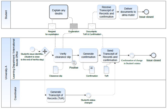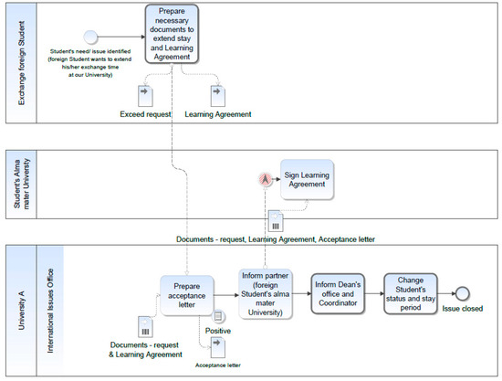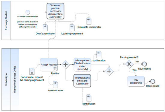 Nowadays, universities are constantly striving to internationalize studies via student exchange programs, such as Erasmus. They are also constantly increasing the number of foreign academic staff and thus adapting themselves to the needs of the changing labor market. The development of contacts between the business world and universities, e.g., organizing foreign internships and apprenticeships for students, is also very important. Modern technologies are increasingly becoming an integral part of everyday life and should be widely included in the education process as well. The CD-ERP approach is an innovative concept that can improve the flow of information between cooperating universities. The authors chose three specific business processes and created maps of them (based on interviews that were aimed at elucidating how they are run in the ‘real world of higher education’). These maps are illustrated in Figure 3, Figure 4 and Figure 5. All of these examples are related to cooperation between two (or more) universities in the education process. The following processes that facilitate the exchange of a student between his/her “alma mater” and a hosting university were taken into consideration: