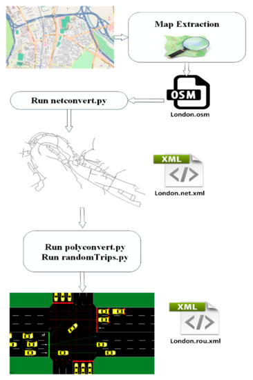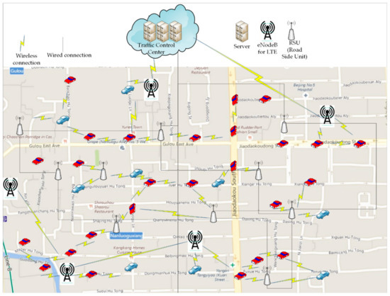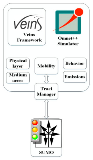 The simulation was performed on a real map of a part of Beijing city. The simulated map was extracted from OpenStreetMap [28]. The area of 4.5 km2 was extracted by specifying the GPS coordinates of the desired area. The road network was extracted from the raw map using the simulation of urban mobility platform SUMO [29], see Figure 4. The proposed system was simulated using Omnet++ network simulator by implementing vehicular behaviors with the vehicular framework Veins [30]. The simulation parameters are depicted in Table 2. During the simulation, three modules ran simultaneously. Veins was responsible for the network simulation, while SUMO ran the road traffic simulation and sumo-launched acted as a broker between the two modules. SUMO dynamically updates the traffic-related values through the Traci interface, as shown in Figure 5.