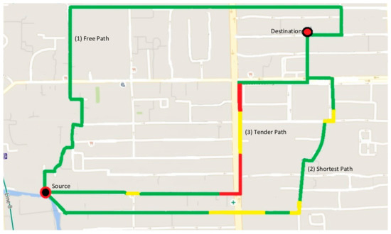where and are the shortest path and the shortest free path of the vehicle , respectively, and is the travel delay of road , and is the travel delay of road .