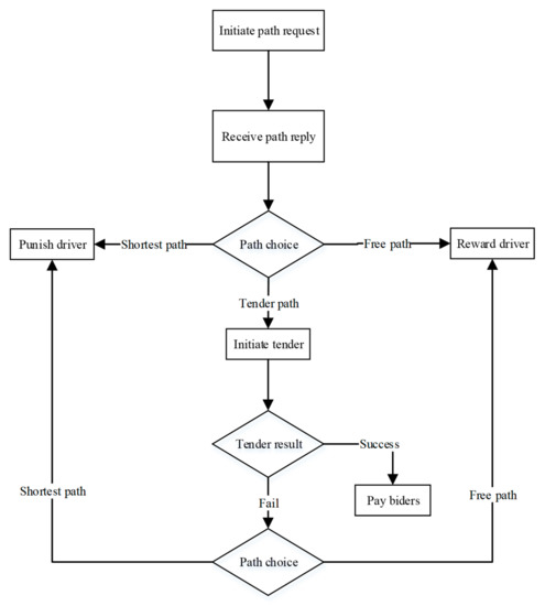 After computing the shortest path ((2) in Figure 2) and the free path ((1) in Figure 2), the driver decides which path the vehicle takes. If the vehicle chooses to take the shortest path, it is punished for using a congested road during rush hour and has to pay, in T-Coin, the sum of all the paid traffic quota in each road segment in its shortest path, whereas if the vehicle chooses to take the free path, it is rewarded in T-Coin, estimated by the difference of travel delays between the shortest path and the free path.