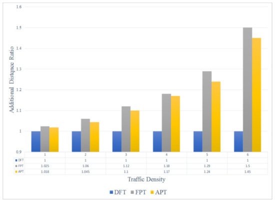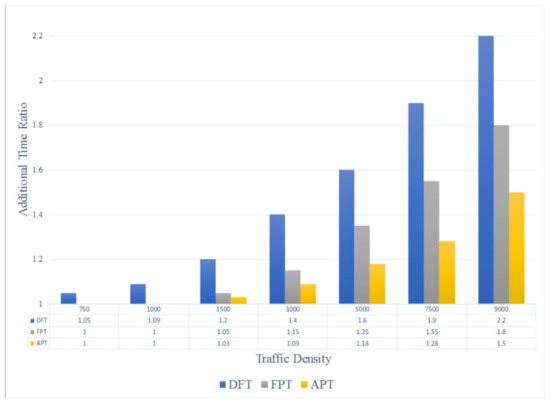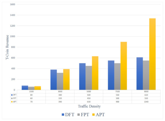 In Figure 7, the AD of the three schemes in different density scenarios is presented. In the low-density scenarios (under 750), the AD of the three schemes is negligible, but in the medium- and high-density scenarios, FTP’s and APT’s AD increase moderately to reach 1.6 at the highest density, because the alternative free paths are usually longer than the shortest path. However, DFT has no AD even in very high-density scenarios, because the shortest path is always taken. Some could argue that DFT is preferable since it has no AD. It is true that the distance in DFT is optimum and the vehicle does not have to travel additional distances to avoid the congestion, nonetheless, this comes at the cost of the enormous increase in the travel time, as shown in Figure 6. In other words, in our proposed system, there is an increase in terms of additional distance because some of the vehicles are willing to drive an additional distance and arrive early, for example, some prefer to drive an additional 2 KM and arrive in 15 minutes, rather than travel 1 KM and arrive in 30 minutes and pay T-Coins.