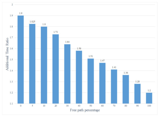 Additional Time (traveling time/estimated traveling time) This metric is used to measure the additional time that the vehicles have consumed in order to reach their final destination as compared with the initial estimated time of the shortest path. In other words, we compute the ratio of the actual traveling time from the starting point to the destination point, and the traveling time starting point to the destination point using the shortest path. We denote the additional time of vehicle as , and it can be computed as in Equation (12), and the total additional time of all vehicles is computed as in Equation (13).