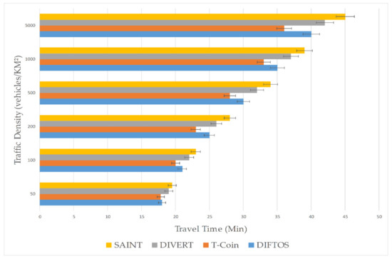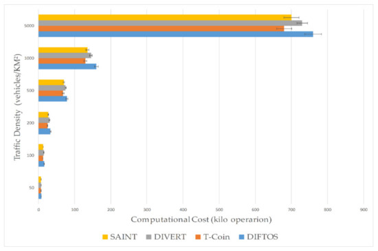 In addition to the comparison with T-Coin’s variants, we have also compared it with the following congestion alleviation systems, DIFTOS [22], SAINT [23], and DIVERT [25]. We have compared the simulated systems based on two metrics, the average travel time of all the simulated vehicles and the computational cost performed by the traffic center servers. Figure 10 shows the average travel time of each system in different traffic density settings. Throughout different traffic conditions, we observe that T-Coin has the shortest travel time as compared with the other systems, which is due to T-Coin’s alternative paths rerouting strategy. DIFTOS and DIVERT performs better than SAINT, due to their distributed architecture that allows updating the assigned routes frequently without contacting the central traffic server, which is the case with SAINT. Figure 11 shows the computational cost in the traffic center server for each system in different traffic conditions. Although T-Coin has the best performance in terms of computing cost and DIFTOS has the worst performance, it is worth mentioning that the computing in DIFTOS is distributed among many clusters of vehicular servers that are spread throughout the city map, unlike the case of SAINT and T-Coin where the traffic center server is centralized, and DIVERT that has a hybrid server architecture.