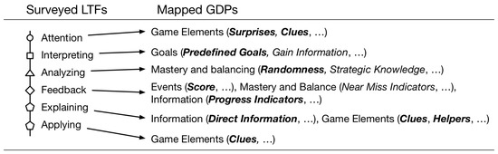 Having a connection between Grosser’s LTFs and Bjork and Holopainen’s GDPs (Kelle’s work [30]), the process would resort to identifying what were the specific LTFs for Software Engineering topics, and then converting them into GDPs, thus providing a scaffold for designing an effective educational game for Software Engineering Education.