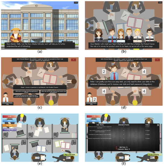 E4 Game screenshots. (a) Guru Master introducing the game. (b) Team being introduced at first planning meeting. (c) Player choosing which question to ask the Product Owner. (d) Team mates discussing why they chose their estimates. (e) Office screen. (f) Ending current sprint screen.