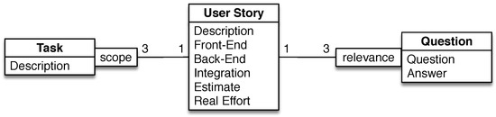 A User Story (see Figure 4) is composed of a textual description (Description), a complexity/difficulty level for its three scope components (Front-End, Back-End and Integration, ranging from 1 to 4), an estimate (Estimate, given during Planning Poker) and the actual effective effort of completing the user story (Real Effort, never disclosed to the player).