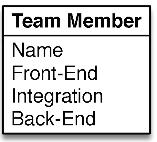 A Team Member (see Figure 5) is composed of a Name, a skill level for each scope component (Front-End, Back-End and Integration, ranging from 1 to 4). To map the profile descriptions of the team members, their actual stats during the game were (FE/I/BE): Peter (2/2/4), Sarah (3/3/1), Adam (4/1/2) and Barry (1/2/2). These skill levels were used, not only to select the appropriate task during discussion but to compute each member’s confidence level when estimating a User Story.