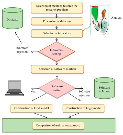The remainder of the paper is structured as follows. At the end of Section 1, the research problem and the aim of the paper are formulated. Section 2 is the literature review. This section lists various methods and models designed to assess business financial health and to detect its failure. A special part of Section 2 is devoted to the overview of the theoretical knowledge about the DEA method. Section 3 describes the research sample, selection of indicators, and theoretical background of applied models. The main models used in the paper are the BCC DEA model processed in DEAFrontier software and the logit model constructed in Statistica software. Section 4 lists the results for the BCC DEA model, which were verified by applying the logit model. Section 5 includes the discussion, in which the results achieved in this paper are compared with the results of other studies. This section also summarizes the essential conclusions resulting from the research and presents the significant findings. The process of the research is illustrated in Figure 1.