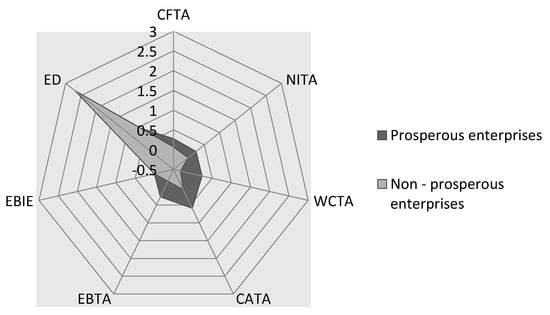 The financial distress frontier is formed by businesses that achieve relatively low values for inputs and at the same time relatively high values for outputs; these are businesses with a high probability of financial problems in the future. Regarding inputs, average profitability (NITA) is 2.6%, cash flow to total assets (CFTA) represents 7% and working capital to total assets (WCTA) is −31%. Comparison of the results of prosperous and non-prosperous businesses is shown in Figure 2.
