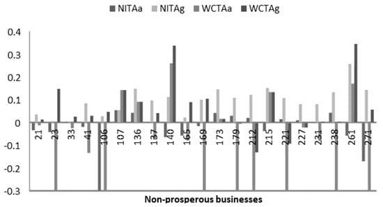 The greatest benefit of the DEA model is the calculation of goal values for inefficient DMUs that would make them efficient. Figure 3 shows selected inputs (NITA, WCTA) and their goal values for a group of non-prosperous businesses.