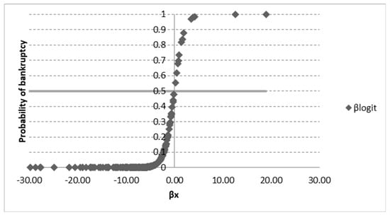 Figure 4 shows the distribution function of the logit model, which takes values in the range <0.1> and is symmetrical around the cut-off level 0.5. Businesses above the cut-off level are likely to fail, while those below the cut-off level are less likely (or not likely) to fail.